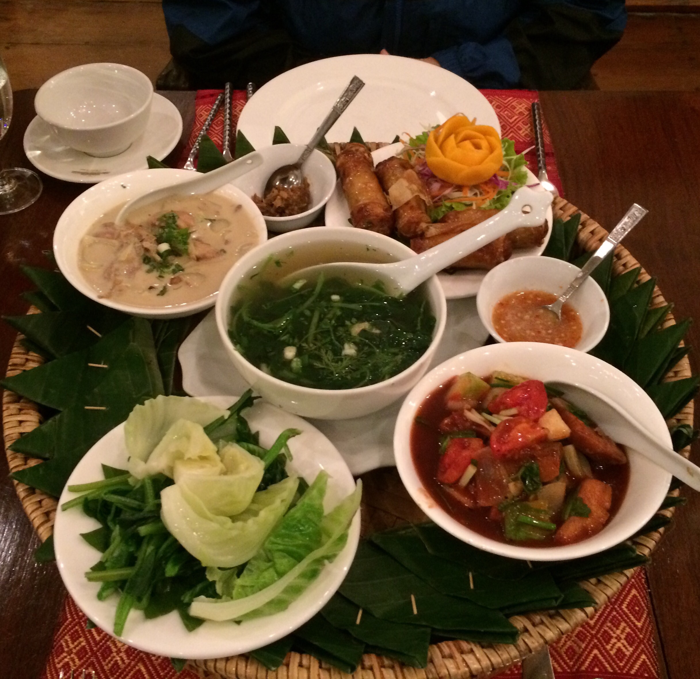 And the long day ends with a traditional Lao feast of coconut curry chicken, sweet and sour fish, brown sticky rice, deep fried rolls and a clear broth with local green vegetables. All to the accompaniment of an exquisite local dancer and musician.