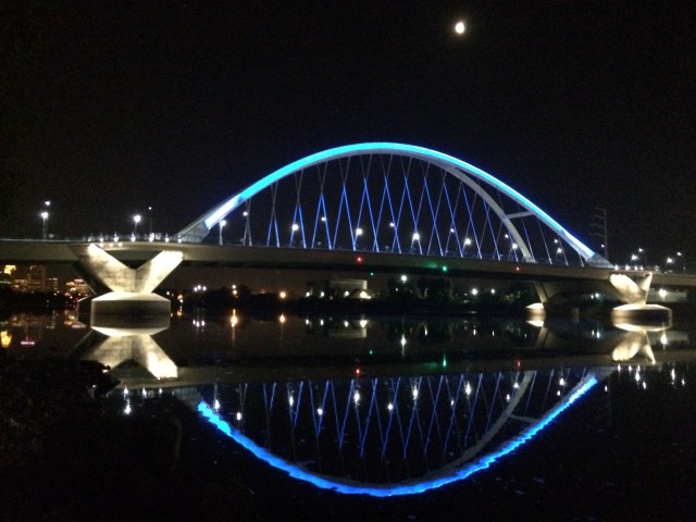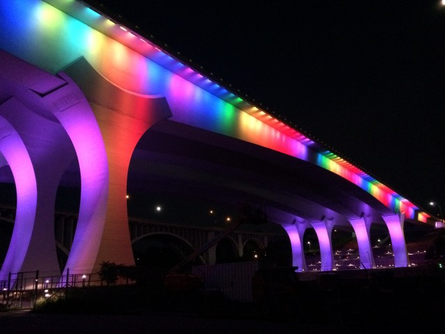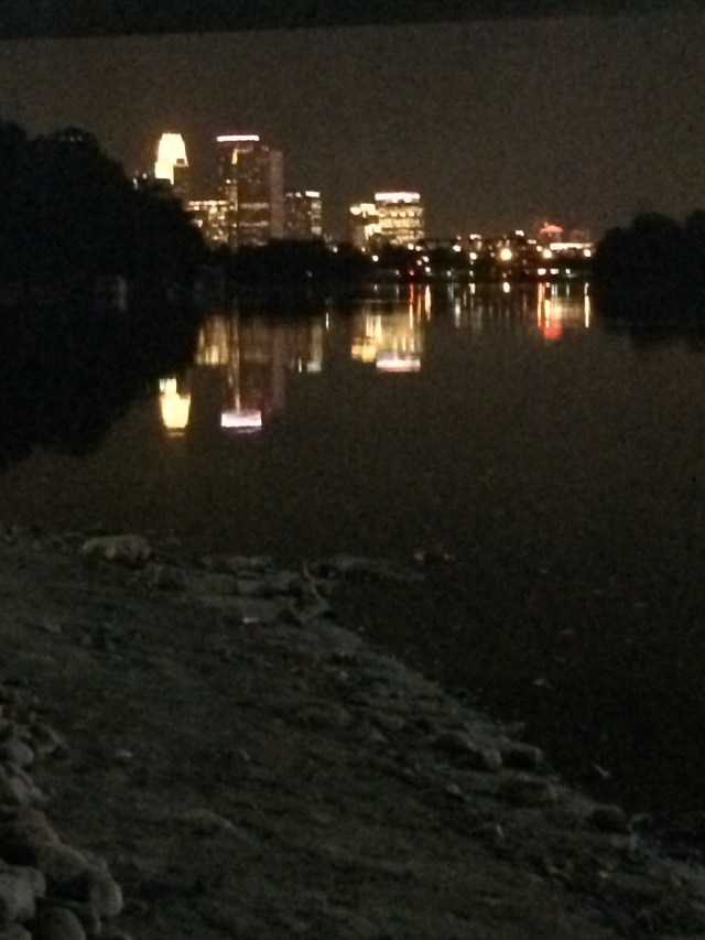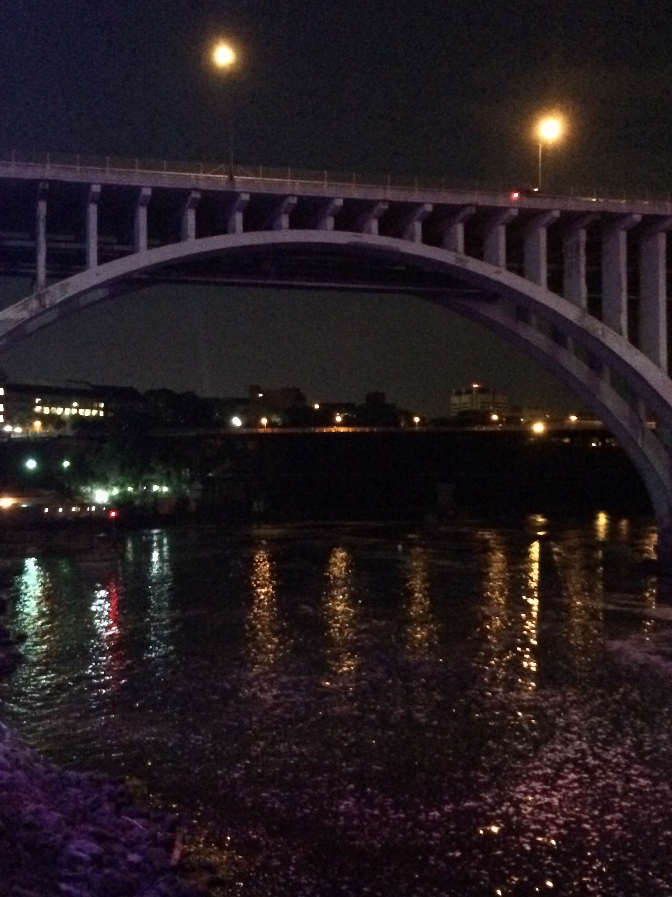 The I-35 bridge featured above has been rebuilt since it collapsed into the Mississippi in August 2007. I remember the evening vividly as I was driving downtown and was caught in the massive traffic back up. It was a sad event and memories of that day came rushing back as I stood under the massive arches of the new bridge only 5 feet above the swiftly flowing water. It is not possible to imagine the terrifying plunge from over a 100 feet into the water but as I stood there that night I was overcome by a dueling sense of grief and peace. I now use the bridge often to go to the University of Minnesota and it was a unique experience to see the impressive engineering from the bottom up. It’s beautifully designed and gracefully  built.