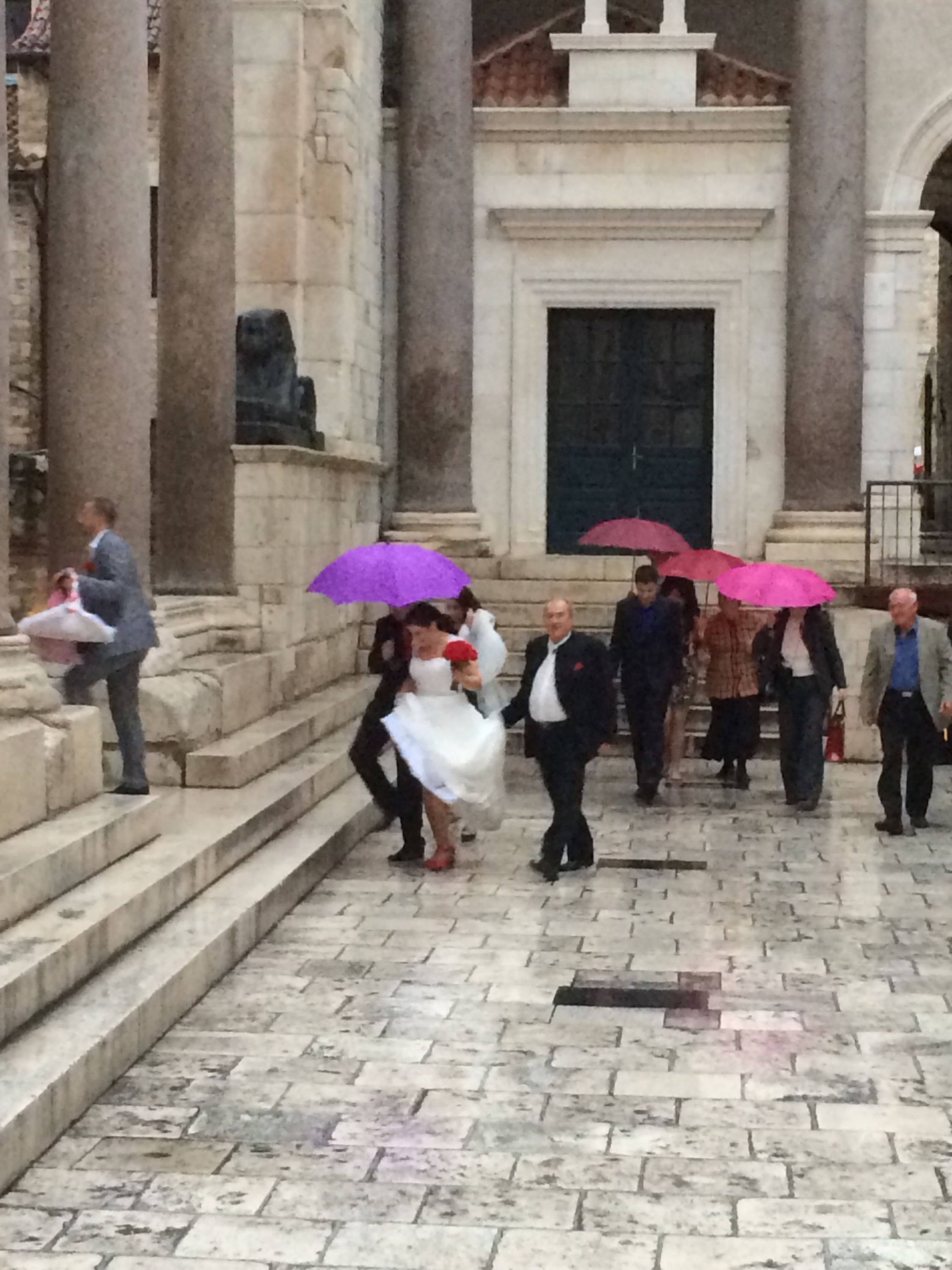 The ancient stones of the main cathedral square could not have envisaged modern weddings and contrivances such as the umbrella.