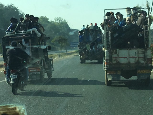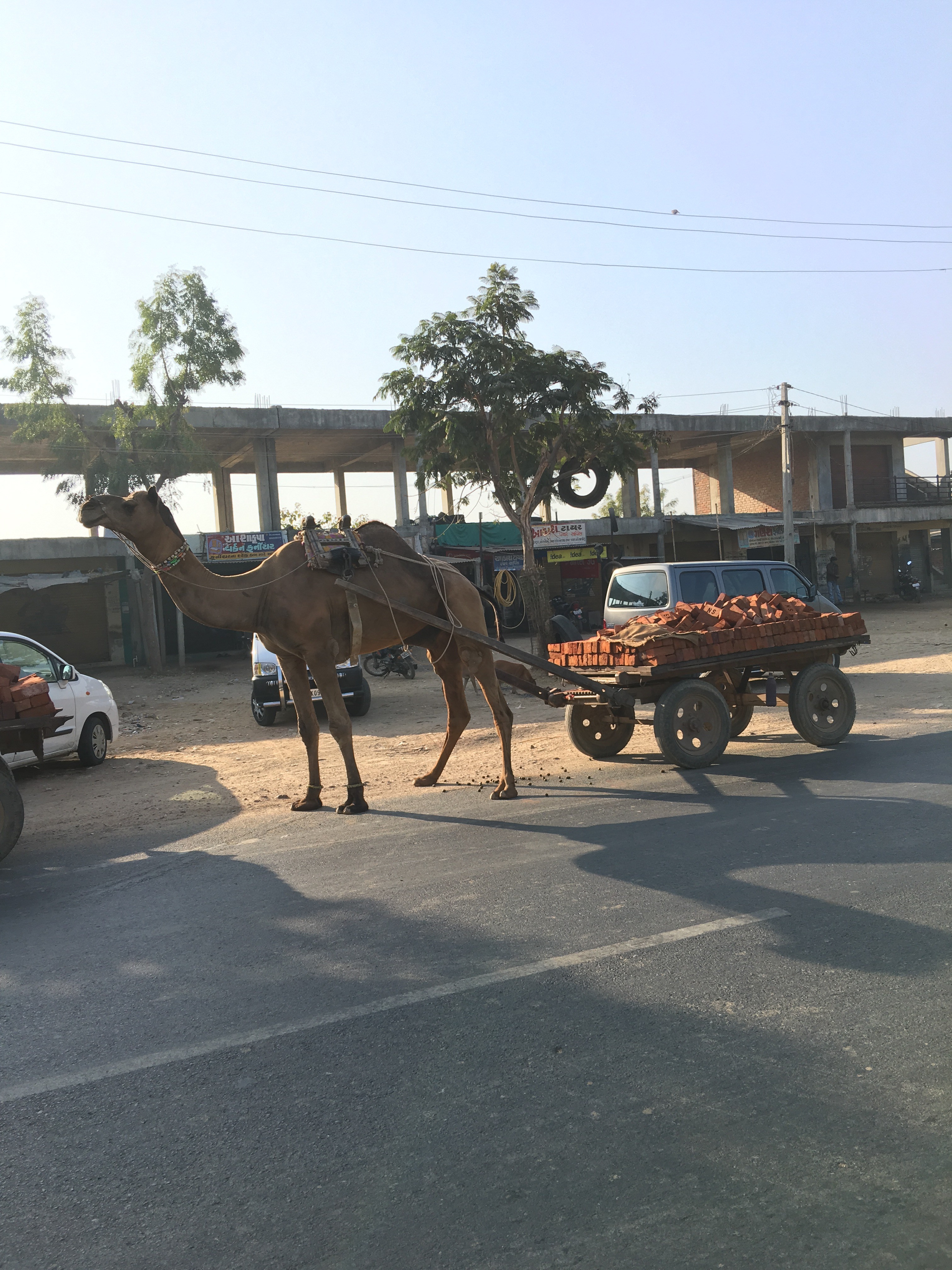 Transportation reflects the dichotomy of old and new as in all aspects of life in India. While camel carts plod along with loads of straw and brick, the human body is also a source of carriage as is overloaded trucks with kids and youth hanging precariously off the top, sides and back to excitedly join rallies in support of India’s 67th Republic Day.