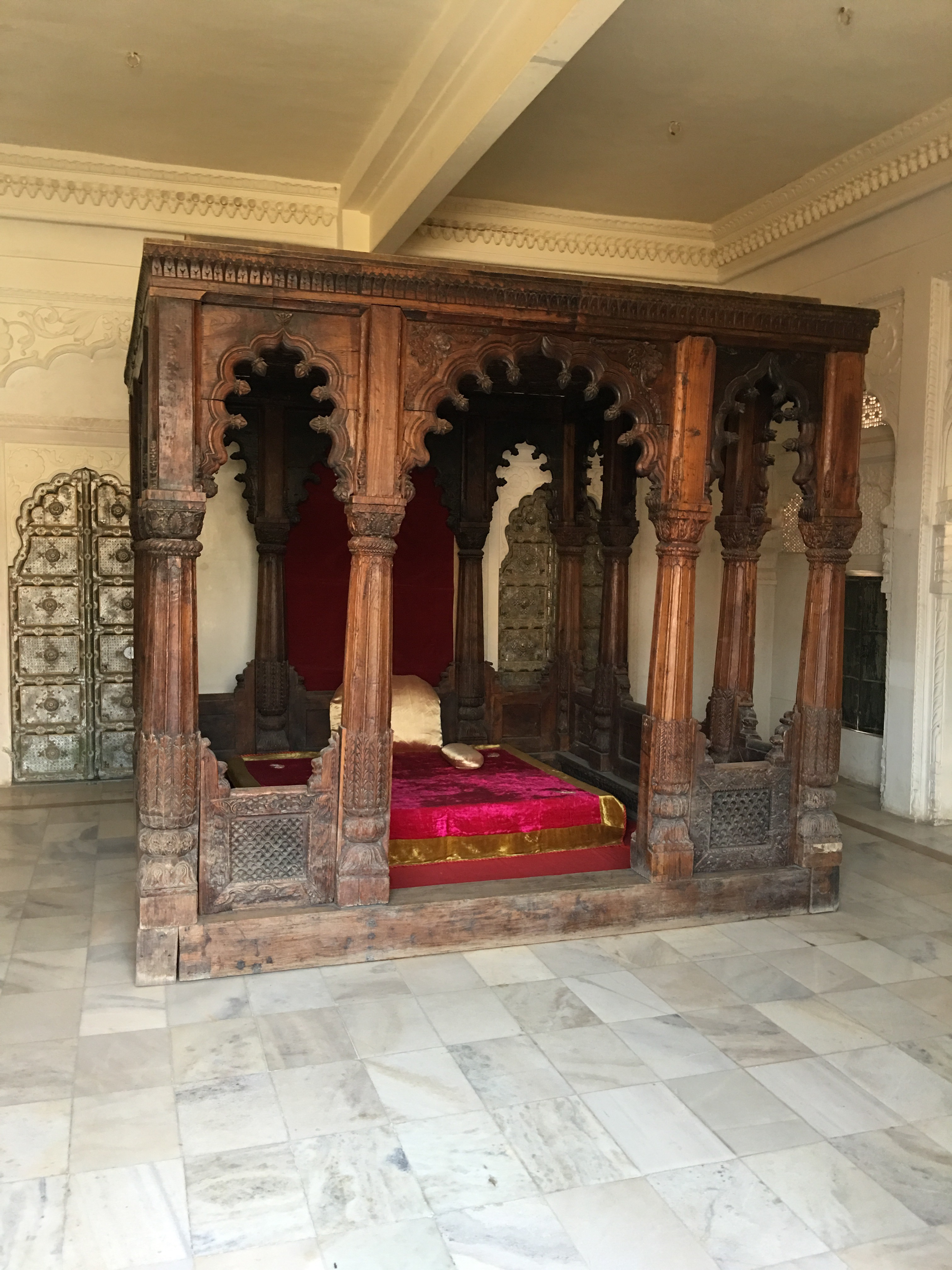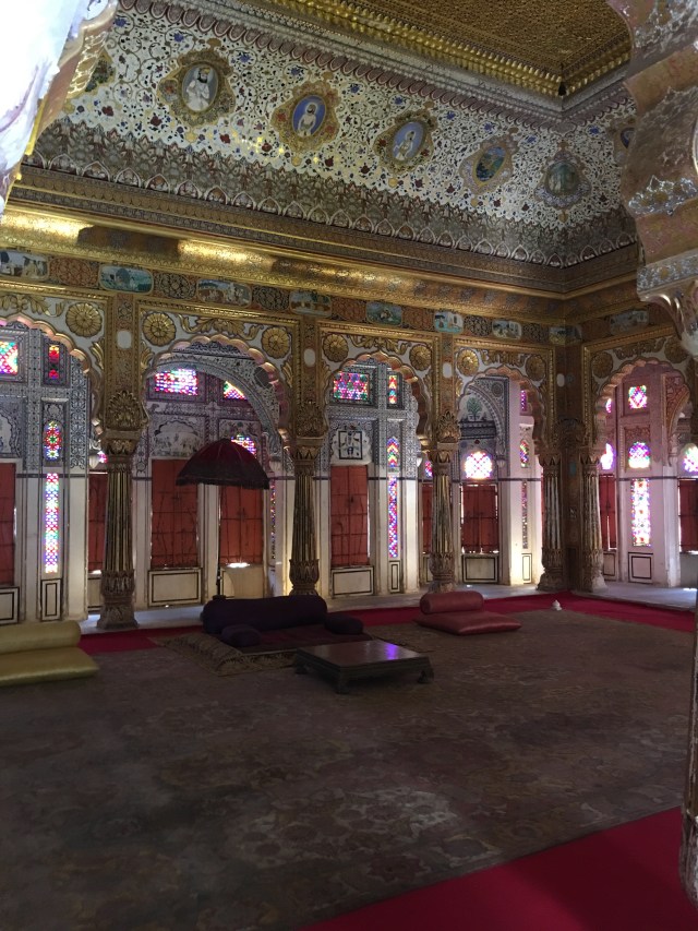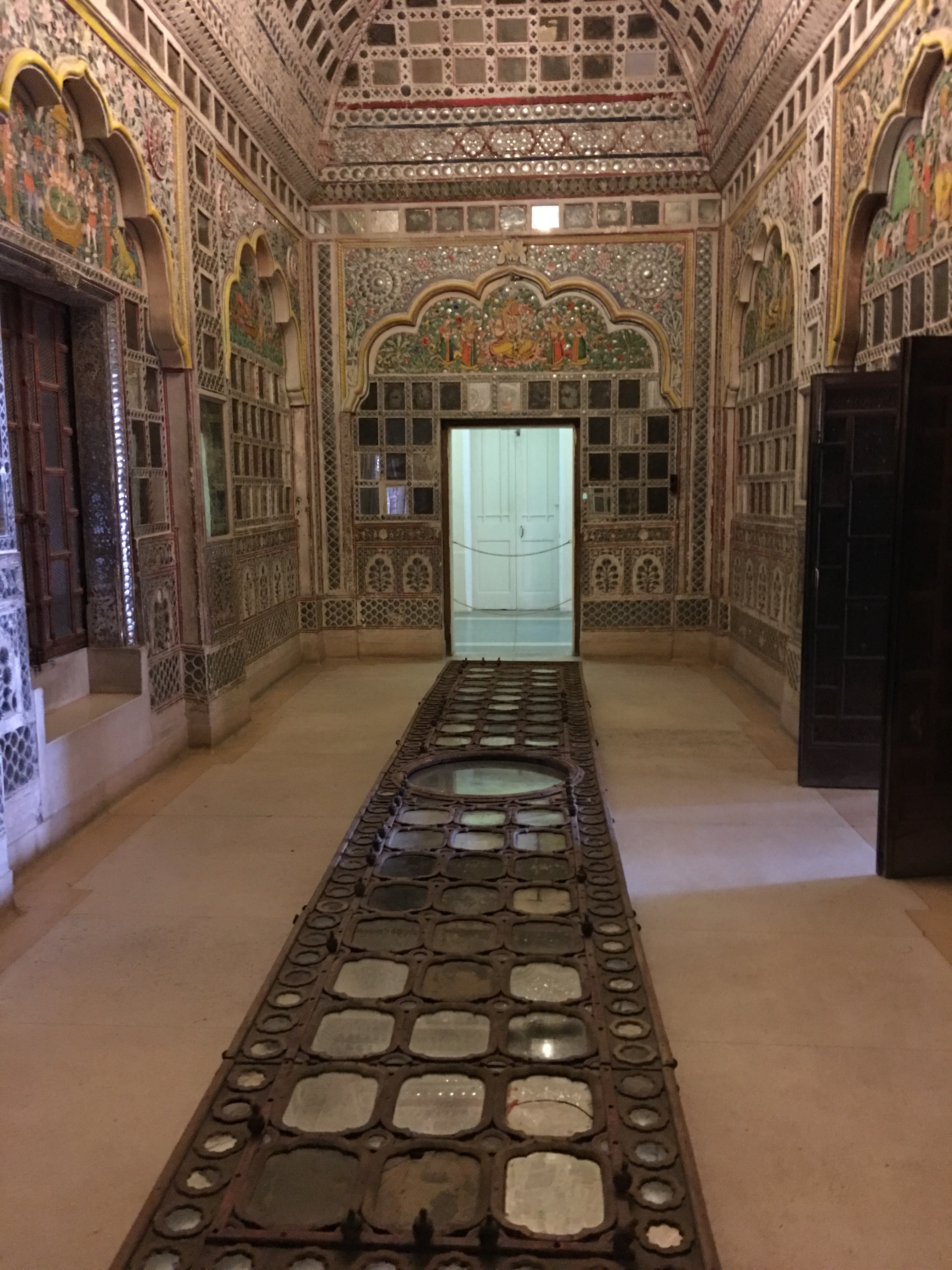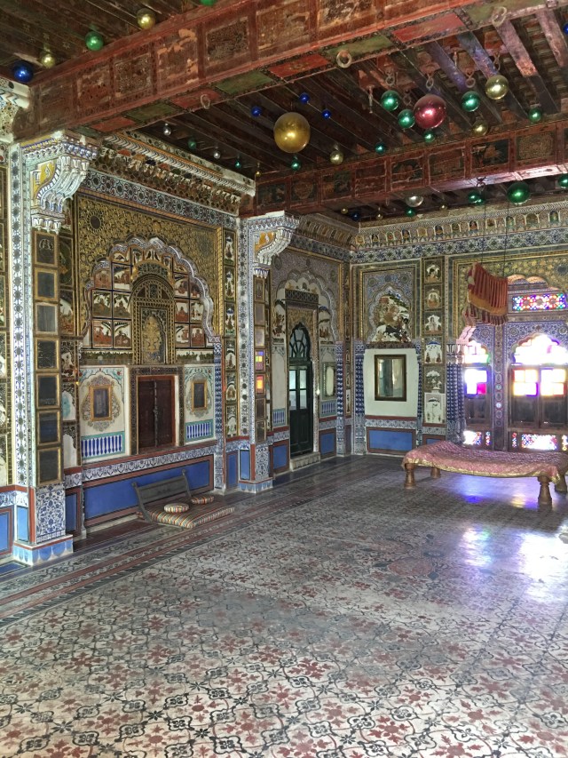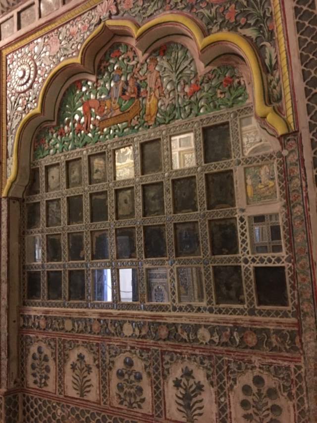 Inside lie marvels of palace rooms glittering with mirrors and ornamentation in which the Maharaja received dignitaries and his harem lived in seclusion high above the populace amongst scented bowers cooled by gentle  breezes.