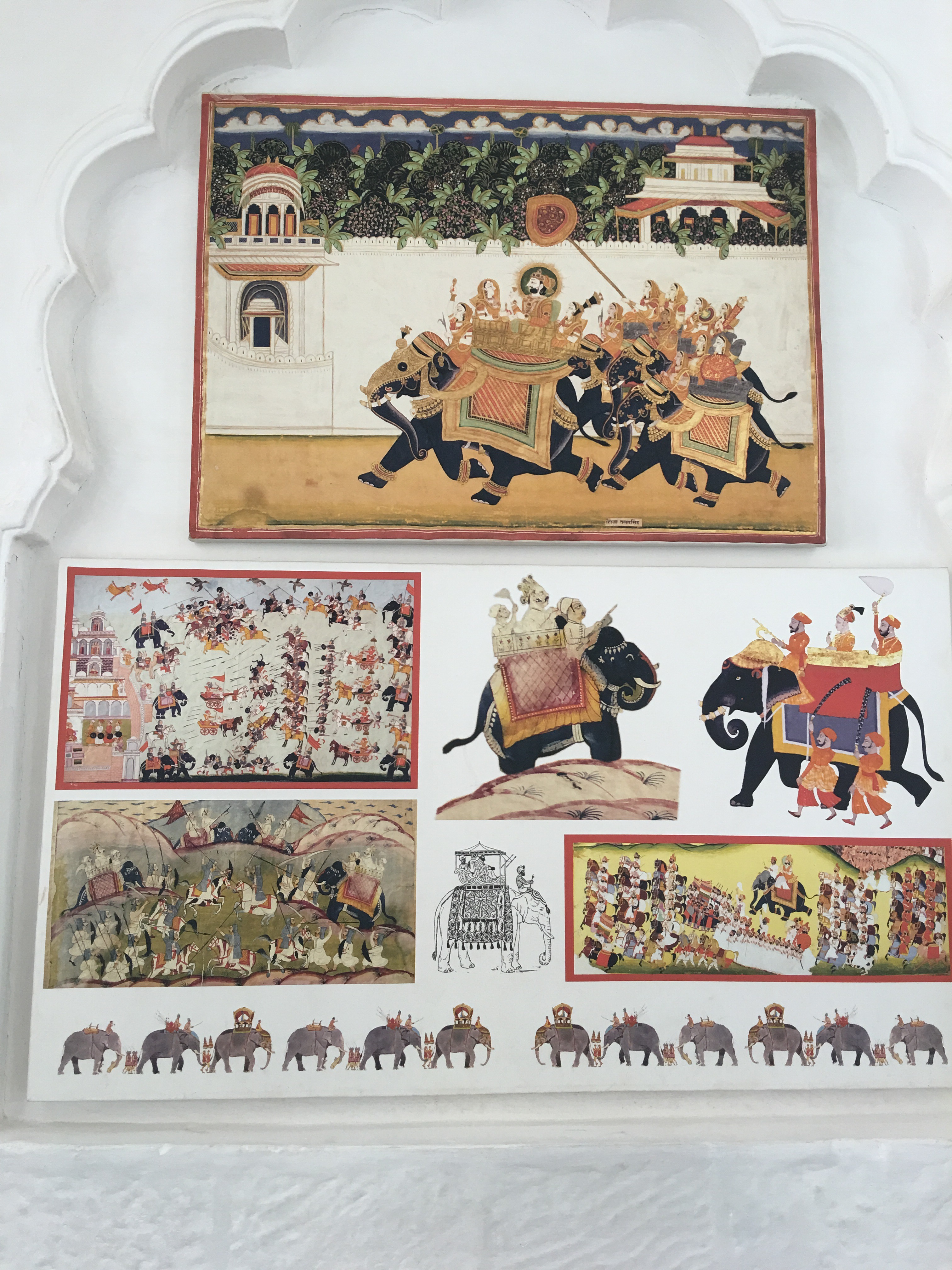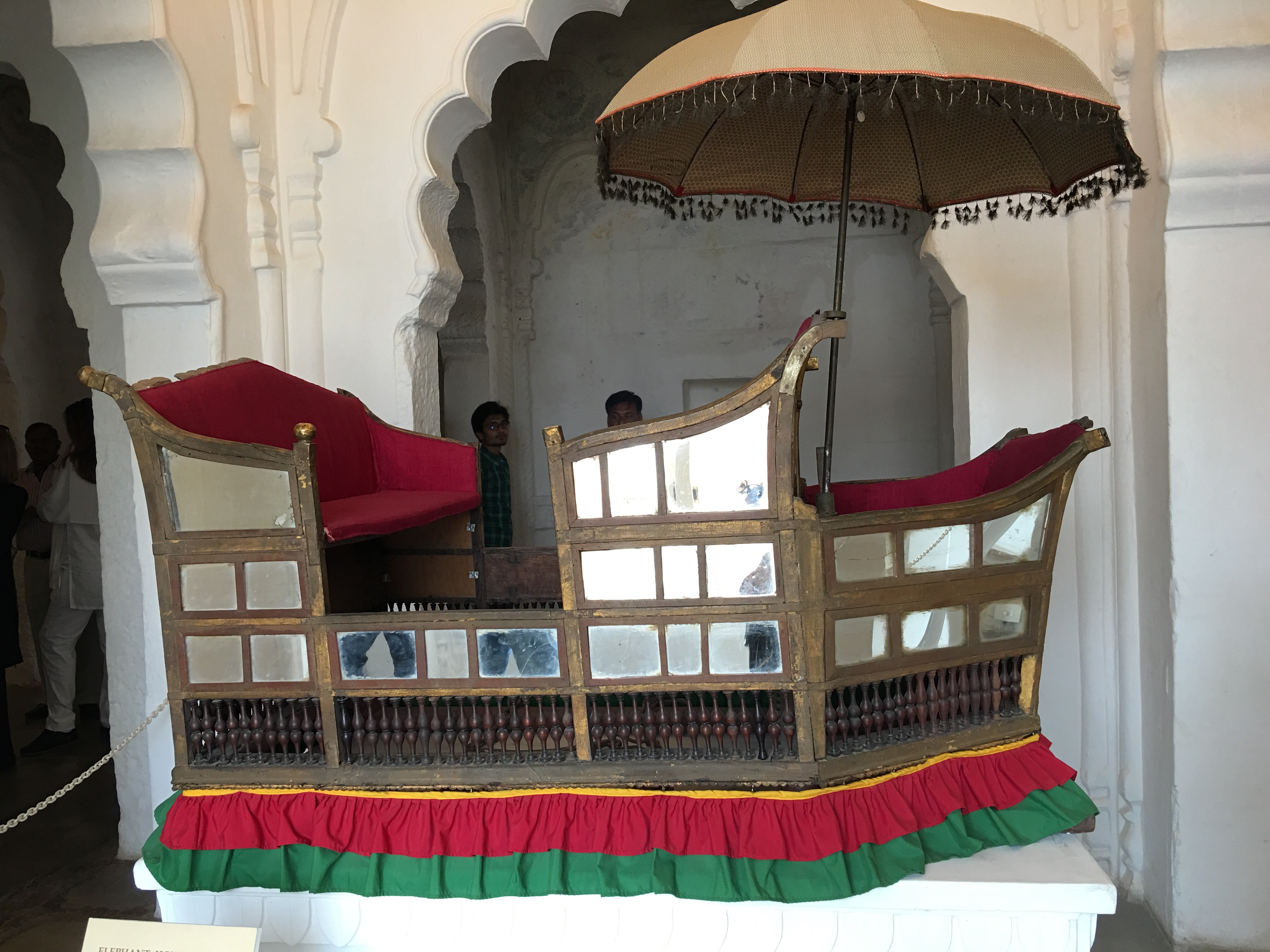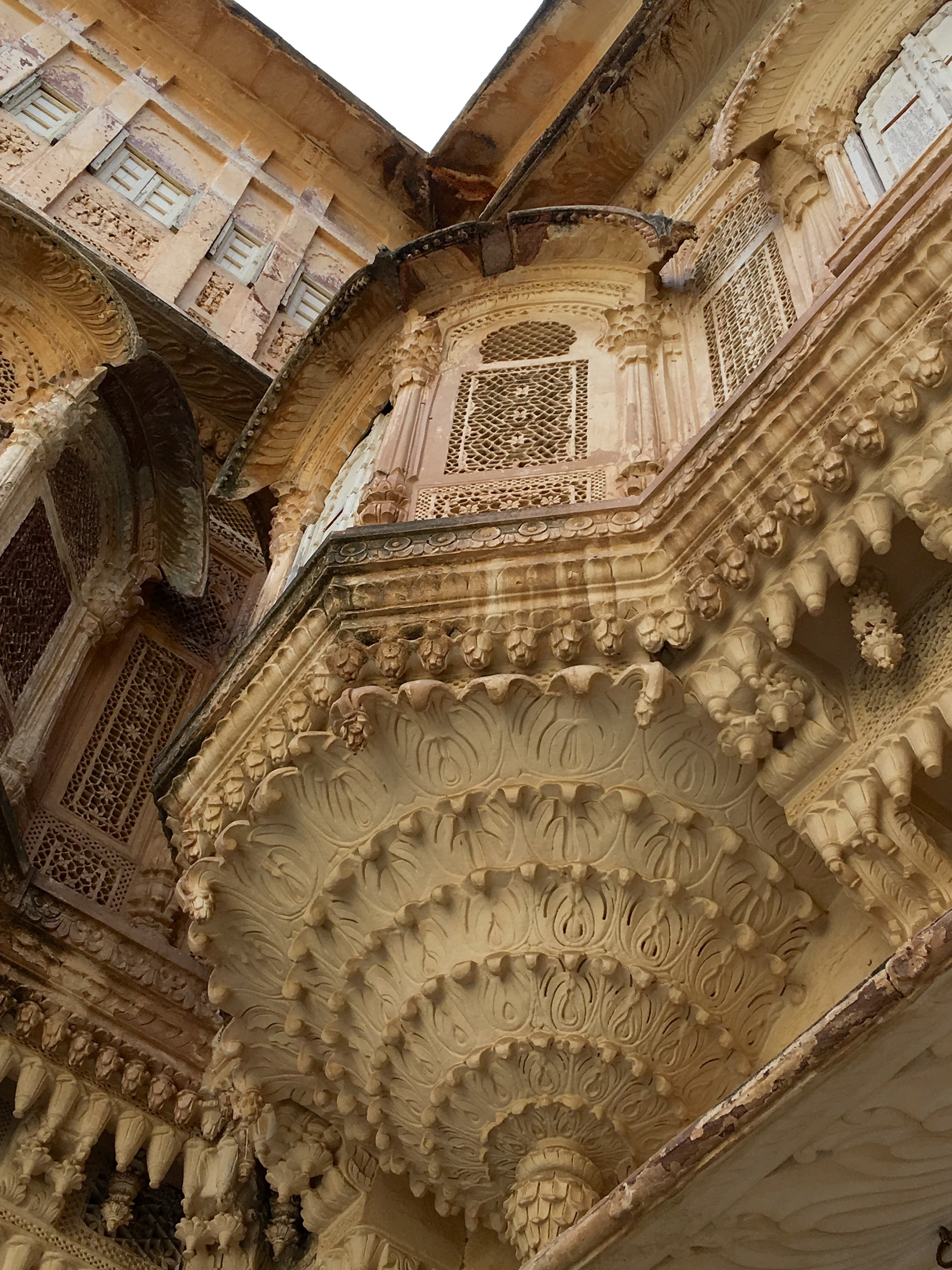 Inside lie marvels of palace rooms glittering with mirrors and ornamentation in which the Maharaja received dignitaries and his harem lived in seclusion high above the populace amongst scented bowers cooled by gentle  breezes.